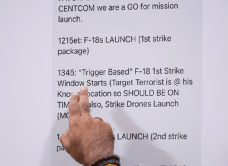 - “1345: ‘Trigger Based’ F-18 1st Strike Window Starts (Target Terrorist is @ his Known Location so SHOULD BE ON TIME – also, Strike Drones Launch (MQ-9s)”