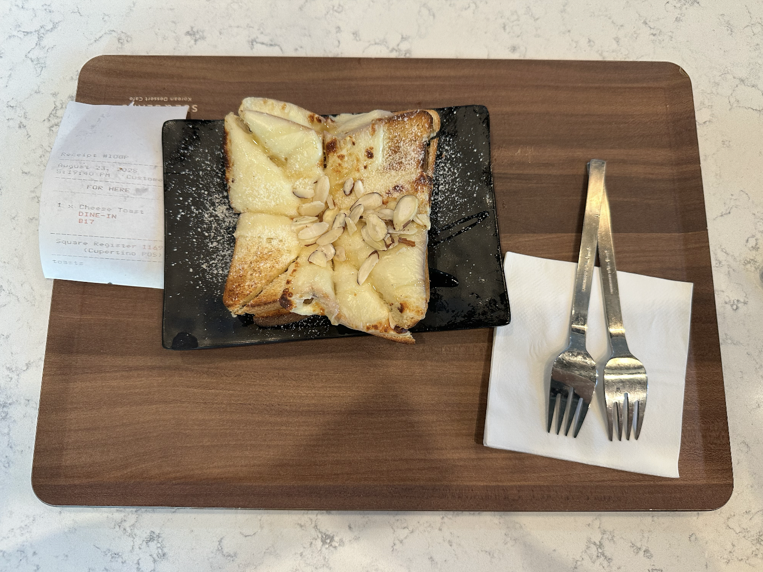 My family ordered the Strawberry and Mango Cheese Sulbing, along with a Mozzarella Injeolmi Toast. The sulbings both included a small cup of sweetened condensed milk, and after taking the necessary photos, we dug in! Digging into the heart of the matter, the sulbings were frosty and sweet, perfect for a hot summer day. I preferred the Mango Cheese Sulbing, as the sweet and juicy mango gave the shaved ice a refreshing taste. The Strawberry Sulbing had beautifully sliced strawberries, and wasn’t overly sweet, perfectly matching the Asian palate. Overall, we loved these desserts.