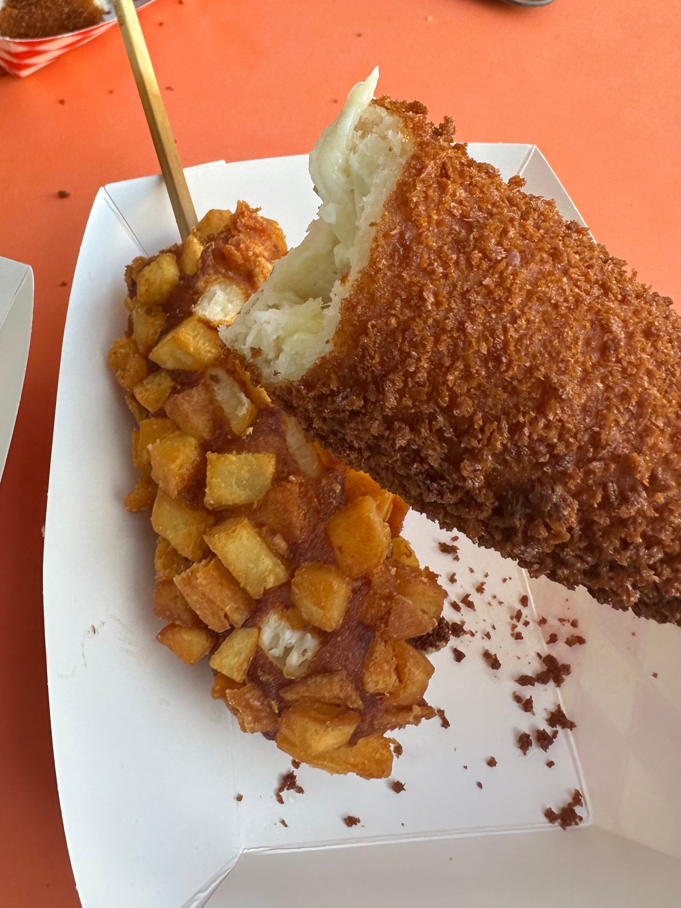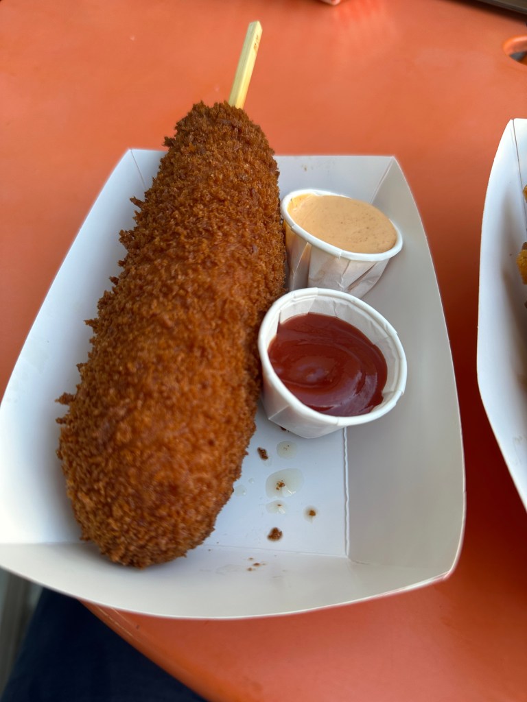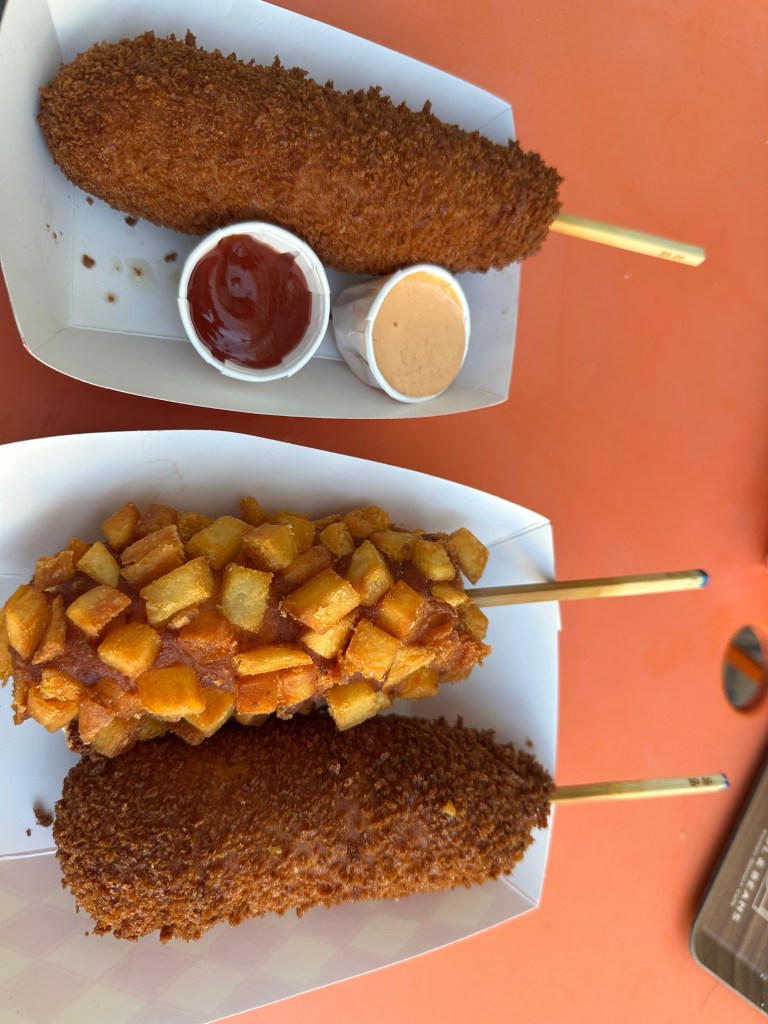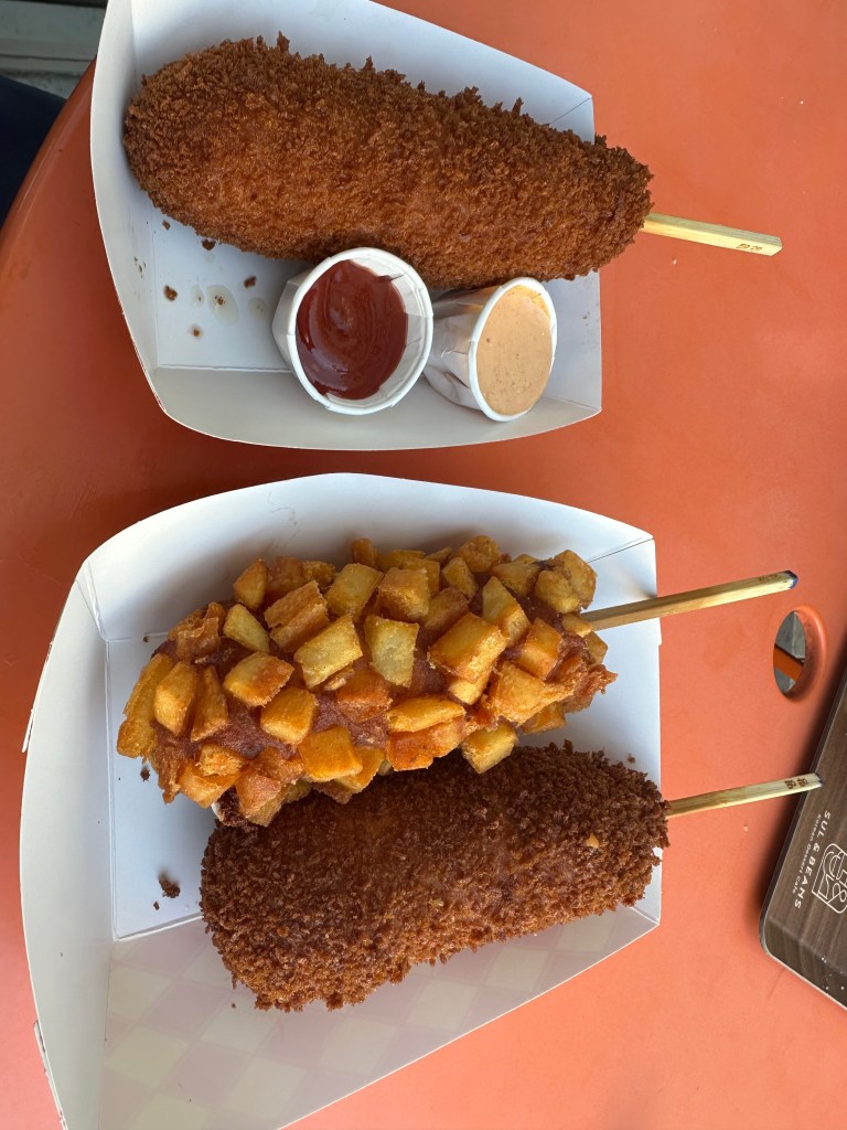 I am back with another article about food. This time, we have Myungrang Hot Dog, located at Main Street Cupertino. I tried three flavors: the Original Hot Dog, the Mozzarella and Sausage, and the Potato Hot Dog. Made fresh, the hot dogs were piping hot and crispy, wonderfully flavorful, and the Mozzarella and Sausage had a great cheese pull. Overall, the hot dogs were really good, and I would definitely recommend this shop to anyone who likes food.