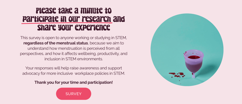 Individuals can support period equity by talking openly about menstruation, challenging stigma when they encounter it, and advocating for inclusive practices within their institutions. However, this is not just the responsibility of those who menstruate. Allies of all genders and backgrounds play a critical role in creating truly inclusive and equitable STEM environments, as well as initiatives like STEM the Flow. Supporting our mission by participating in our anonymous online survey (only for scientists), by donating (we’re a fully self-funded initiative), and by spreading the word and sharing our work can really amplify our message and help building momentum for change.